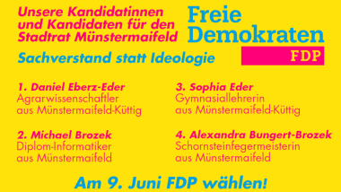 02.05.2024 Kommunalwahl 2024: Stadtrat Münstermaifeld Die Kandidatinnen und Kandidaten der FDP für den Stadtrat Münstermaifeld. Mehr dazu
