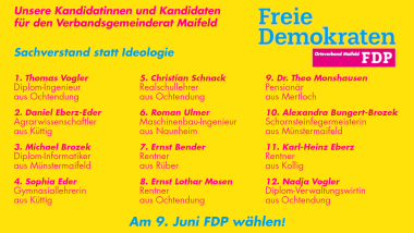 01.05.2024 Kommunalwahl 2024: Verbandsgemeinderat Maifeld Die Kandidatinnen und Kandidaten der FDP für den Verbandsgemeinderat Maifeld. Mehr dazu